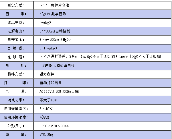 仪器符合GB/T7600;SH/T0246;GB/T606及采用卡尔—费休法测定样品中水分的有关标准,仪器采用了先进的自动控制电路,电解电流自动跟踪控制,外型结构新颖,从而使该仪器工作更可靠,使用更方便,具有分析速度快(一分钟出结果)、操作简便、精度高、自动性强等特点,同时具有自动打印功能,可将实验结果、做样时间、样品编号自动打印出来,广泛应用于石油、化工、电力、铁路、环保等部门。